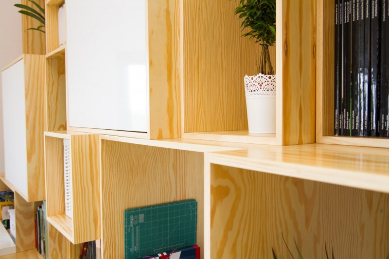 Para esta oficina se diseñó un interior donde el blanco y el pino canario de sus cerchas de madera y mobiliario fueran protagonistas. El espacio se concibe en realidad como una super estructura compuesta por un sistema modular de cubos del mismo tipo de madera que las cerchas de madera de la cubierta, permitiendo su reutilización, transformación y mutación a lo largo del tiempo. El diseño interior de la oficina busca la funcionalidad, creando un entorno acogedor muy próximo a los espacios de viviendas y en línea con las nuevas tendencias del diseño interior de oficinas y espacios de trabajo de las grandes marcas a nivel internacional. Para esta oficina se diseñó un gran espacio de almacenaje vertical donde poder organizar todo lo necesario para un estudio, de manera ordenada, sencilla y bella. De esta manera los propios elementos funcionales se convierten en parte de la decoración interior. Tras cada panel blanco de formica (con apertura push up) se esconden de manera discreta todos aquellos elementos menos atractivos, como los aparatos de aire acondicionado y otras instalaciones existentes en el lugar e imposibles de mover. El espacio se completa con un sistema de mesas blancas de formica de 2,40m sin apoyos intermedios, lo cual permite una gran versatilidad. El pino canario del mobiliario y las cerchas de madera junto con el blanco contrastan con un suelo técnico gris por donde discurren todas las instalaciones y conexiones necesarias para una oficina. La iluminación se resuelve con dos carriles paralelos de luminarias móviles, orientables según las necesidades.