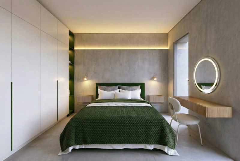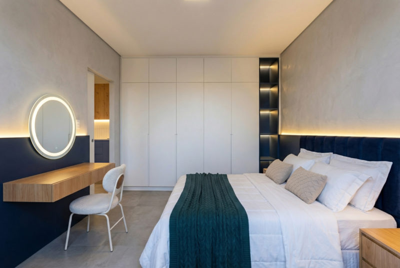 La cama se convierte en la protagonista mediante una composición de ropa de cama en tonos suaves, invitando al relax. Un rincón de trabajo minimalista con escritorio/tocador de madera en vuelo, una silla de tejido suave y un espejo redondo como protagonista, demuestran que funcionalidad y estética pueden convivir en pocos metros.